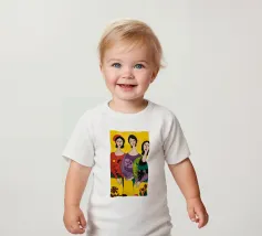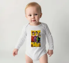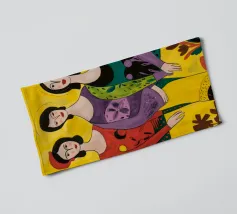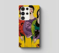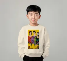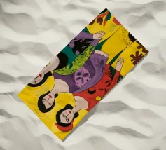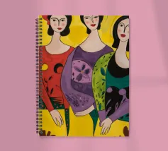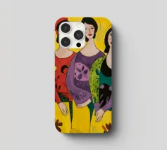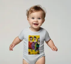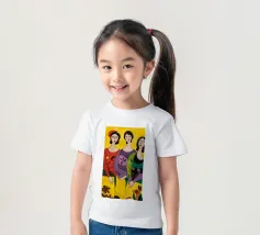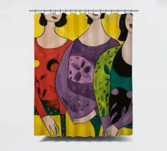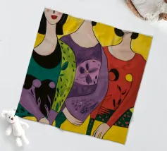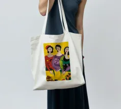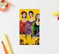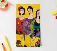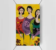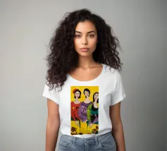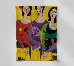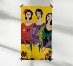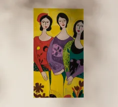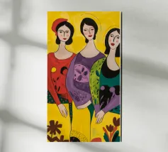 Un'interpretazione moderna e pop art delle Tre Grazie. Le tre donne sono rappresentate in uno stile grafico e audace, con colori e motivi vivaci, creando una dichiarazione di stile e di fiducia sull'amicizia femminile.