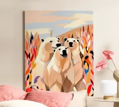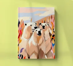 Trasformate il vostro spazio abitativo con questa bellissima stampa d'arte con un dipinto colorato di tre orsi polari in un campo sereno. Questa accattivante opera d'arte riunisce la maestosità della fauna selvatica e la tranquillità della natura, creando una scena armoniosa che è allo stesso tempo vibrante e rilassante. Il dipinto mostra tre orsi polari, ciascuno in una posa unica, in mezzo a un campo pieno di fiori selvatici colorati.