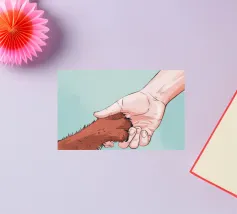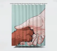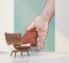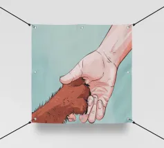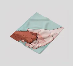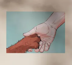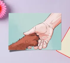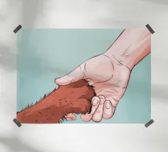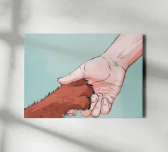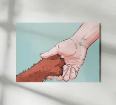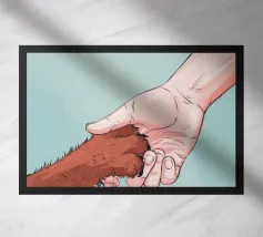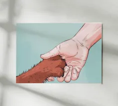 Questa toccante opera d'arte raffigura una mano umana che stringe delicatamente la zampa di un cane, simboleggiando la fiducia reciproca e un legame sincero. Il primo piano cattura la profonda compagnia.