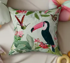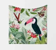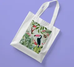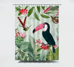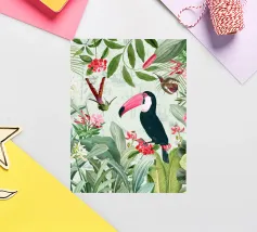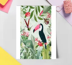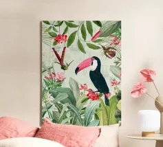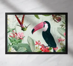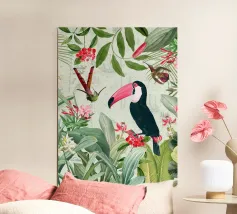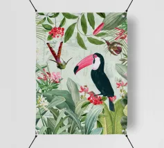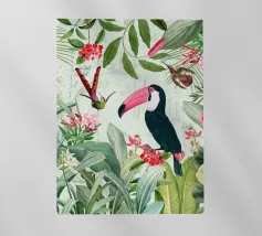 Questo elegante collage vintage è incentrato su un sorprendente tucano, il cui becco vibrante e le piume nere e lucide spiccano sul lussureggiante fogliame tropicale. Intorno al tucano si librano con grazia delicati colibrì, le cui ali iridescenti brillano nelle tonalità del blu e del verde. L'interazione tra l'audace presenza del tucano e il movimento leggero ed etereo dei colibrì crea una scena dinamica e armoniosa. Lo sfondo, con le sue sottili texture vintage, aggiunge profondità e un fascino nostalgico, mentre la ricca vegetazione e i colori vivaci evocano la bellezza di un paradiso esotico.