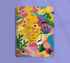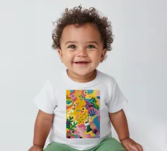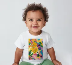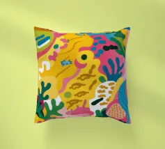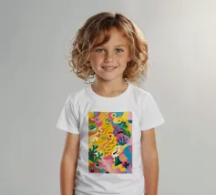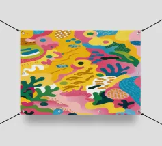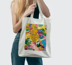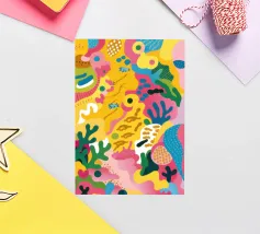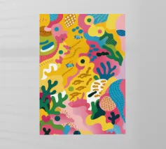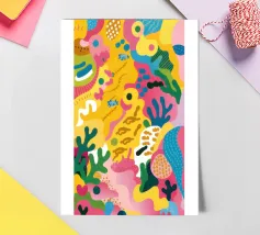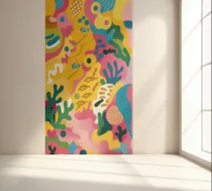 Una colorata composizione astratta presenta un tucano in mezzo a un paradiso di forme giocose e colori vivaci, tra cui giallo, rosa e verde acqua, creando una scena tropicale divertente e vivace.