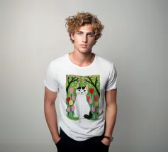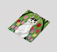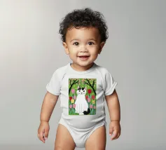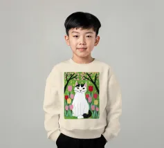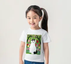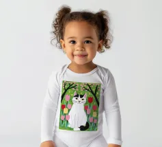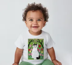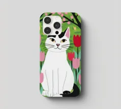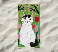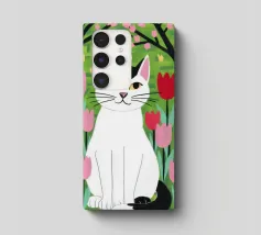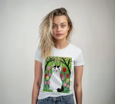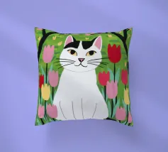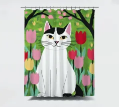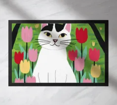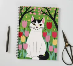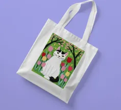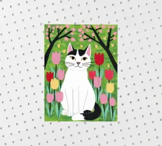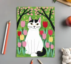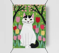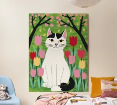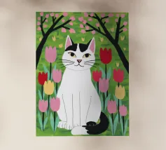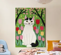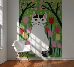 Un'illustrazione dolce e stravagante di un grande gatto bianco e nero seduto serenamente in un giardino di tulipani rosa e rossi, con fiori di ciliegio in alto. L'opera d'arte è una splendida celebrazione della primavera, dei gatti e dei fiori.