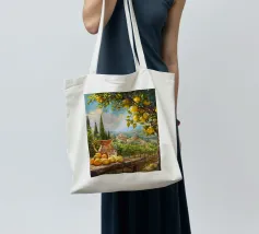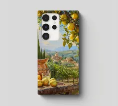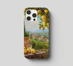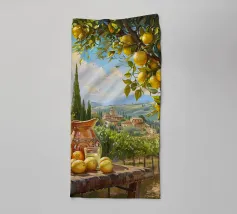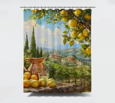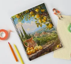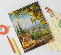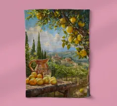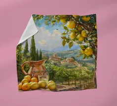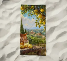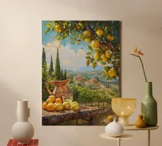 Una scena vibrante e solare di un limoneto toscano, dove i limoni maturi pendono dagli alberi, pronti per essere raccolti. In primo piano, una brocca rustica e un bicchiere di succo di limone fresco poggiano su un tavolo di legno, sullo sfondo delle dolci colline toscane. La calda luce dorata del tramonto bagna il paesaggio, catturando l'essenza della vita di campagna italiana.