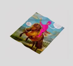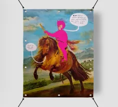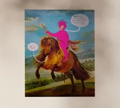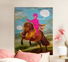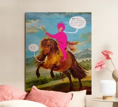 Ciao, sono Dorothée. Sono un'artista di Berlino. Utilizzo materiali di uso quotidiano per riassemblarli sotto diverse angolazioni. Mi piace anche lavorare con la sovrapittura di stampe d'arte (principalmente opere della storia dell'arte occidentale, ma anche immagini di riviste e cartoline). Sovradipingendo la stampa d'arte, la visione dell'immagine cambia e l'immagine cambia il suo messaggio. Sono soprattutto le immagini che servono allo sguardo maschile a essere sovrapitturate dall'artista. Così, le donne per lo più nude e indifese delle stampe si trasformano in guerrieri e supereroi. Le maschere e gli attributi che conferisco loro oscillano tra Catwoman e Pussy Riot. Un tema centrale del mio lavoro è l'esame critico della bellezza standardizzata e la messa in discussione delle abitudini visive tradizionali. La fisicità e la femminilità giocano un ruolo importante nelle mie opere, così come le esperienze quotidiane, le conversazioni e una certa comicità. Spero che vi divertiate con le mie opere, che troviate qualcosa che vi piaccia e che vi diverta a lavorarci quanto me!