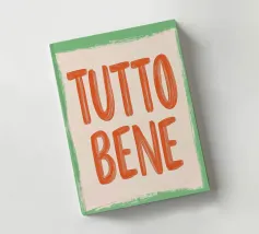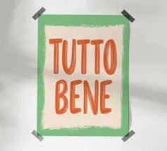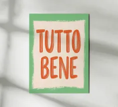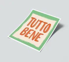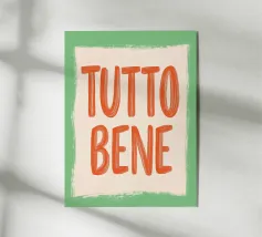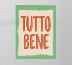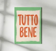 "Tutto Bene" è un allegro slogan italiano che incarna l'ottimismo e la gioia di vivere. Con scritte di ispirazione retrò e colori vivaci come il verde, l'arancione e il beige, questo poster porta vibrazioni positive in ogni stanza. Perfetto per diffondere il sentimento "Tutto andrà bene"!