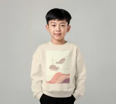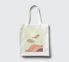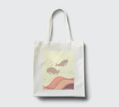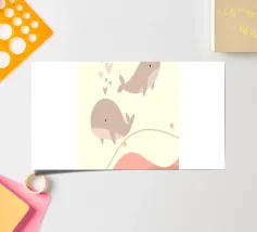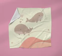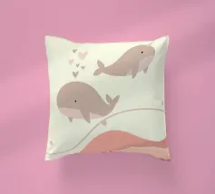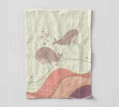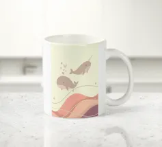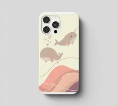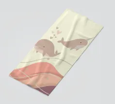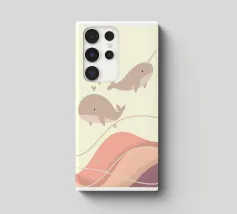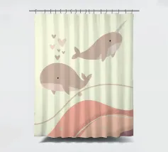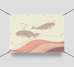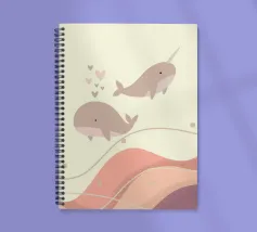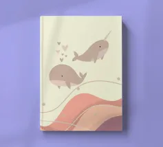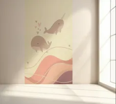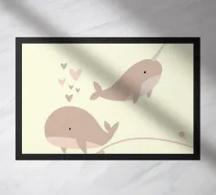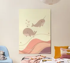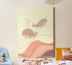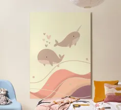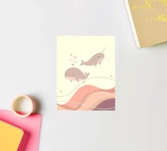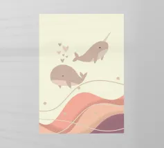 Due adorabili balene, tra cui un narvalo, nuotano sopra le dolci e colorate onde dell'oceano con cuori galleggianti.