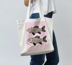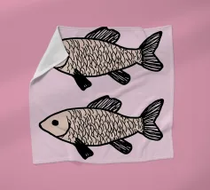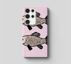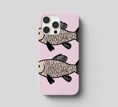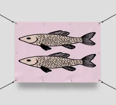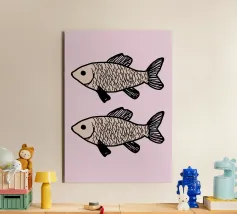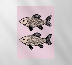 Due pesci identici con squame dettagliate sono raffigurati su uno sfondo rosa tenue. I loro semplici contorni neri e i toni neutri creano un look giocoso e stilizzato.