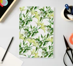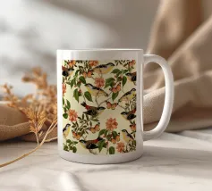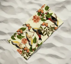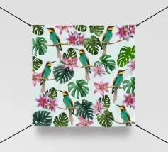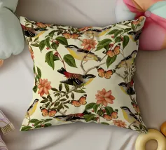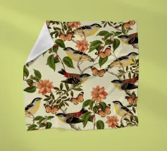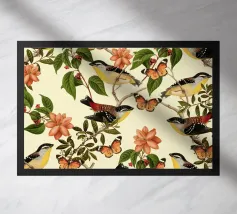 Il fascino botanico incontra la grazia aviaria in questo splendido disegno caratterizzato da uccelli vivaci, farfalle e fogliame lussureggiante.