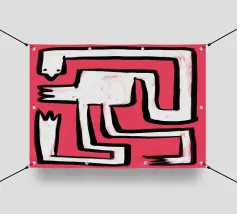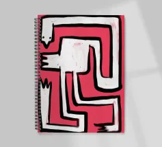 Uccello bianco astratto con contorni neri su sfondo rossastro.