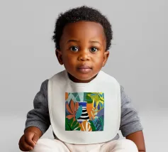 Illustrazione stravagante e surreale di una testa di uccello blu su un corpo che indossa una camicia a righe bianche e nere (una camicia bretone), su uno sfondo astratto.