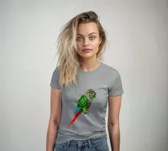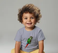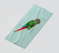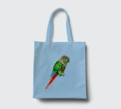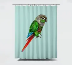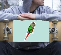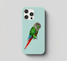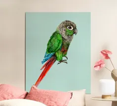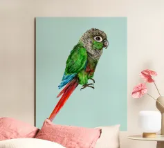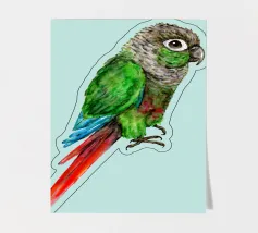 Dipinto ad acquerello di un simpatico conuro dalle guance verdi. L'uccello sembra molto amichevole e soffice.