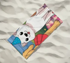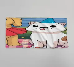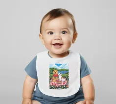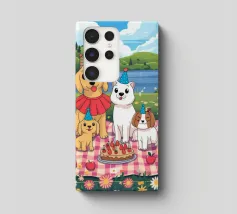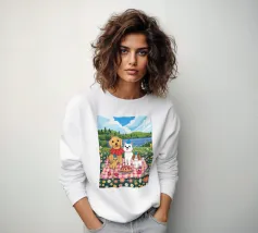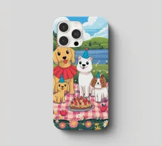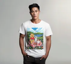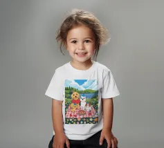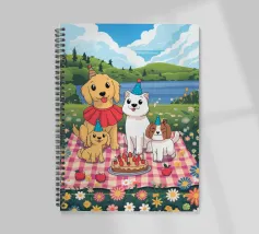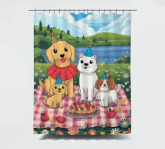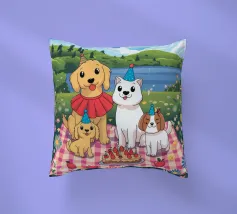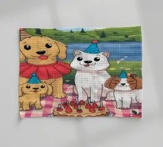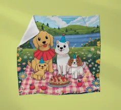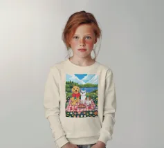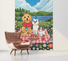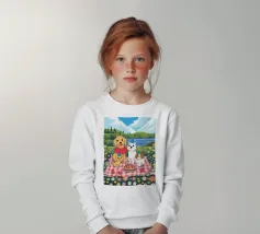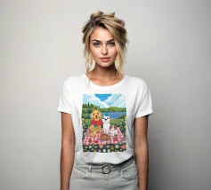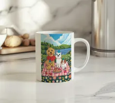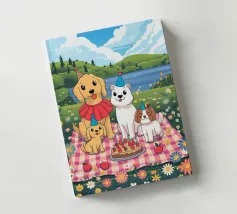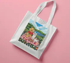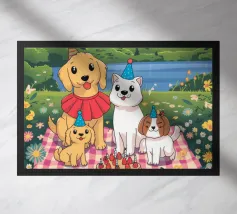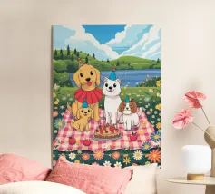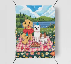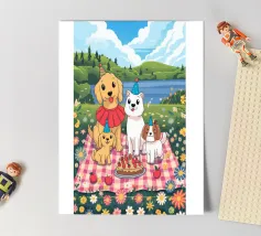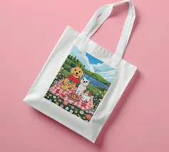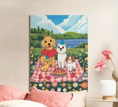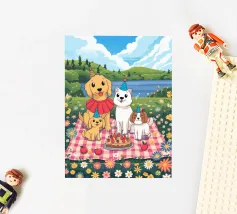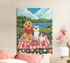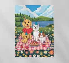 Questa allegra opera d'arte mostra un orso, un cane e un gatto riuniti intorno a una coperta da picnic in riva a un lago scintillante. L'insieme comprende cibo e bevande, incorniciati da alberi e montagne lontane sotto un cielo luminoso. Il disegno celebra l'amicizia e la gioia all'aria aperta.