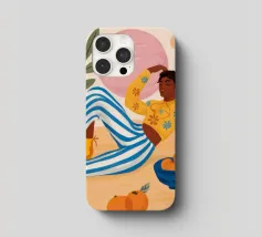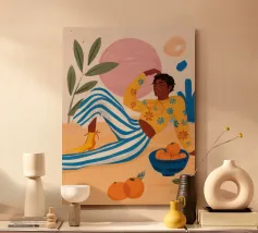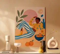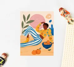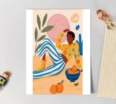 Una gioiosa donna nera con un foulard arancione sorride mentre gusta una ciotola di arance fresche, in un'illustrazione vivace e colorata.