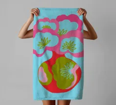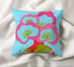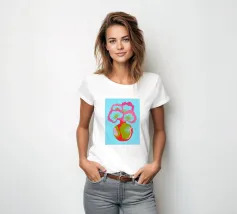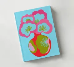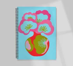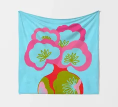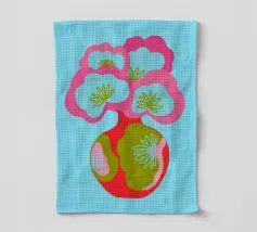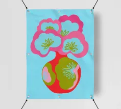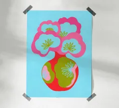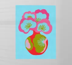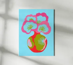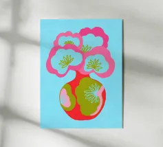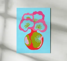 Questa colorata illustrazione grafica mostra un grande bouquet di fiori in un vaso, che delizia con elementi giocosi disegnati a mano in rosa, azzurro e verde. Il design minimalista e astratto combina motivi botanici con un'estetica pop art. Ideale per una decorazione d'interni vivace.