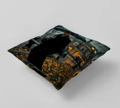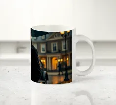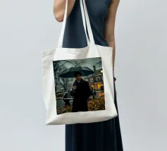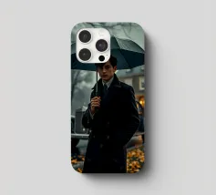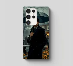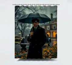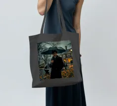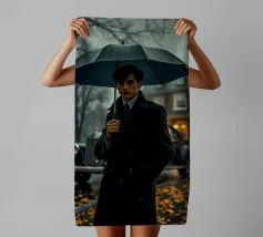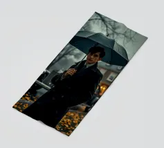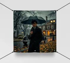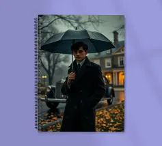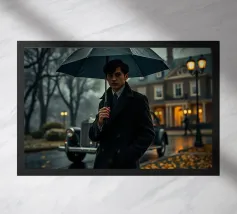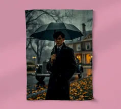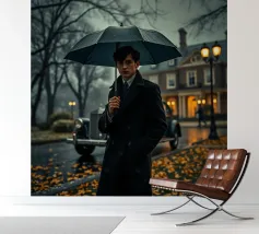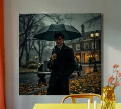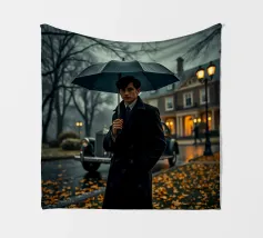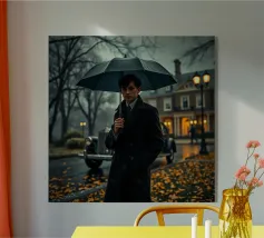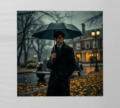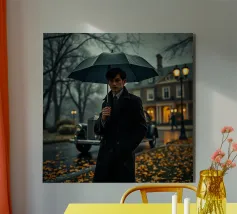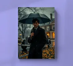 Un giovane uomo che indossa un cappotto e tiene in mano un ombrello nero si trova in una strada bagnata. La scena è ambientata in un quartiere tranquillo, con una casa d'epoca nelle vicinanze e foglie autunnali sparse.