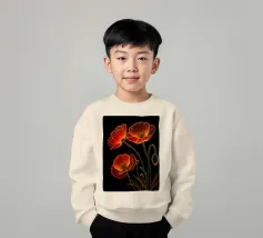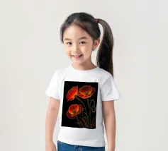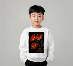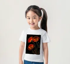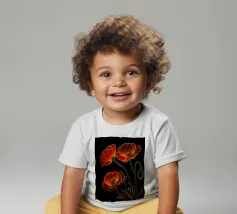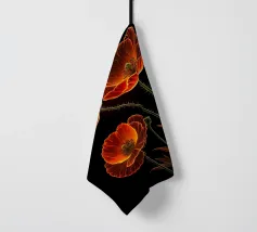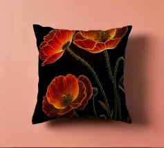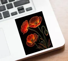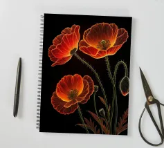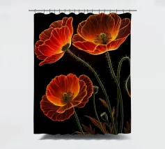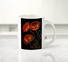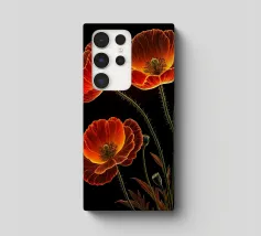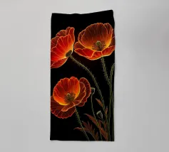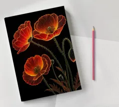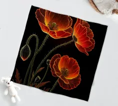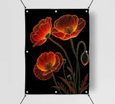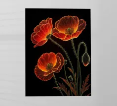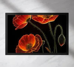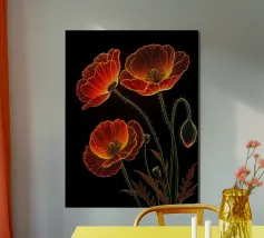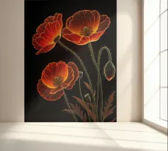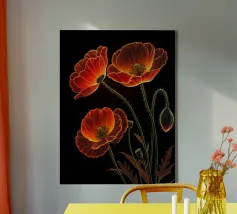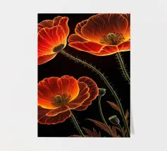 Questa opera d'arte mozzafiato, "Radiant Scarlett Poppy Symphony", cattura la bellezza eterea di tre papaveri incandescenti su uno sfondo nero e drammatico. Ogni papavero si dispiega con un calore incandescente, i suoi delicati petali sembrano illuminati dall'interno, mostrando uno spettro di ricchi rossi, arancioni infuocati e riflessi dorati. I dettagli intricati delle loro forme traslucide sono resi meticolosamente, sottolineando la loro natura fragile ma vibrante. I fiori completamente sbocciati sono accompagnati da graziosi steli ricoperti di pelliccia e da baccelli di papavero in boccio, che alludono al ciclo continuo della crescita e della crescita.