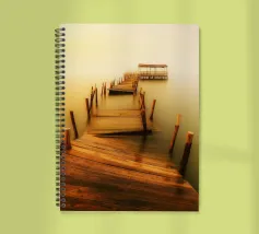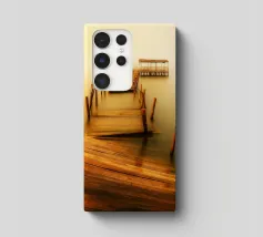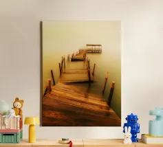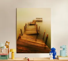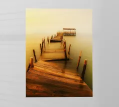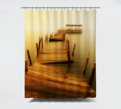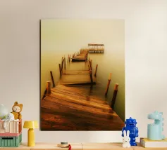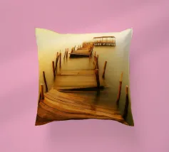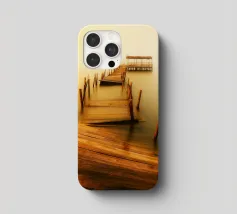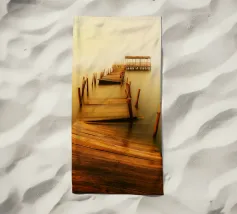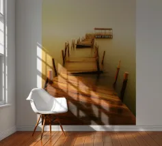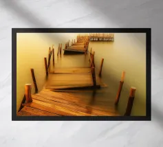 un molo di legno in rovina sulla riva di un fiume torbido