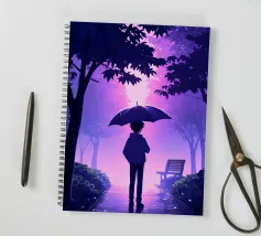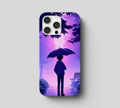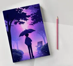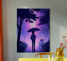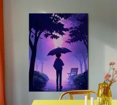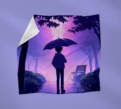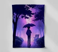Un ragazzo con ombrello in piedi nel parco di notte pioggia Lofi Art