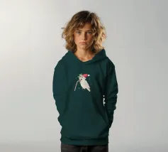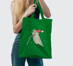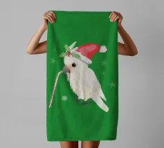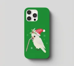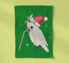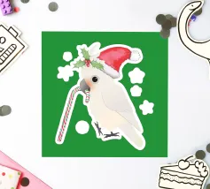 Illustrazione vettoriale digitale di un simpatico cacatua goffin. Indossa un cappello natalizio e tiene in mano un bastoncino di zucchero. La testa nascosta è decorata con agrifoglio. Sembra molto carino.