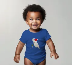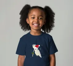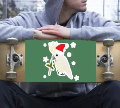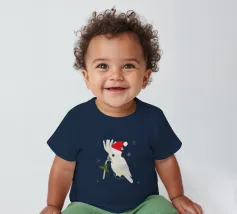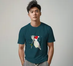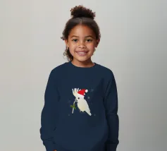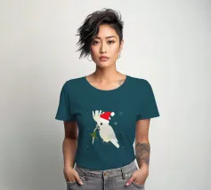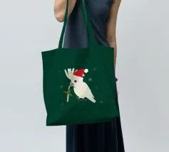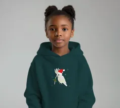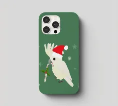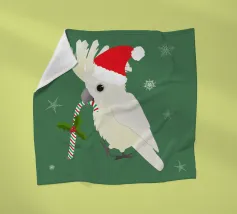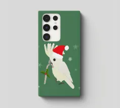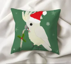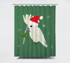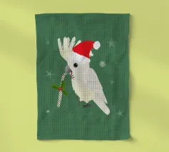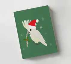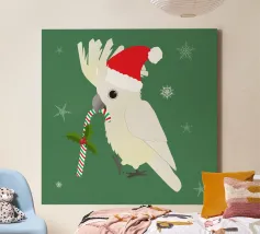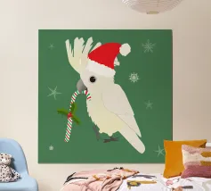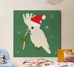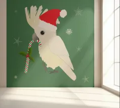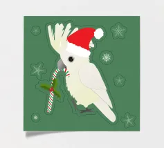 Illustrazione vettoriale digitale di un simpatico cacatua ombrello. Indossa un cappello natalizio e tiene in mano un bastoncino di zucchero. La testa nascosta è decorata con agrifoglio. Sembra molto carino.