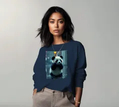 Un piccolo panda sta giocando in una pozzanghera, circondato da acqua piovana scintillante. Lo sfondo mostra luci colorate e una vibrante atmosfera cittadina in una giornata di pioggia.