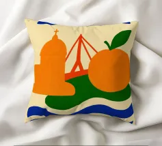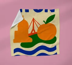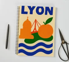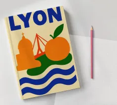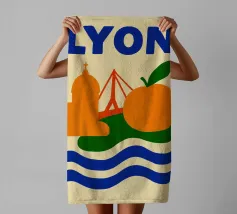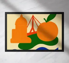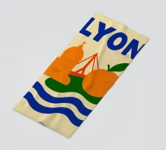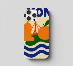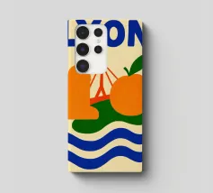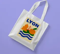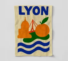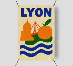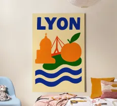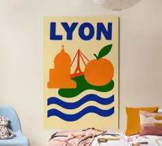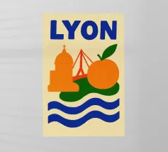 Poster stilizzato di Lione con un gigantesco frutto arancione, la silhouette di una basilica e di un ponte, su uno sfondo di onde blu e verde. I colori vivaci e le forme semplici evocano manifesti retrò, celebrando al contempo il Rodano e l'atmosfera gastronomica della città. Un omaggio grafico e allegro alla capitale della Gallia.