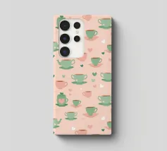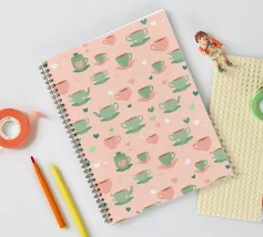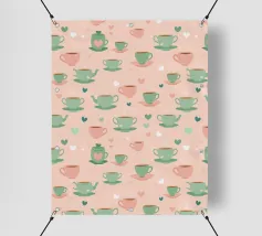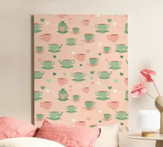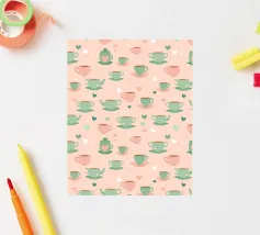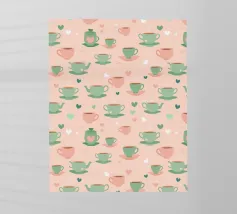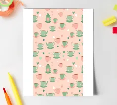 Un affascinante disegno a tema tè con accoglienti tazze, teiere e piattini in morbide tonalità pastello. Il vapore caldo e i cuoricini aggiungono un tocco di comfort e amore al disegno. Perfetto per gli amanti del tè che amano un'estetica accogliente e invitante.