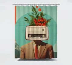 Collage digitale surrealista. Una persona in abito marrone con cravatta rossa ha una radio antiquata al posto della testa. Dalla parte superiore della radio spuntano fiori rossi e foglie verdi. Tre punti rossi fluttuano in alto. Lo sfondo è caratterizzato da un cerchio turchese con una mappa, una striscia verticale rossa a sinistra, montagne e foreste in basso e un cielo limpido a destra.