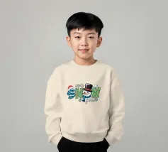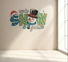 Un design giocoso a tema invernale combina elementi festivi, con un pupazzo di neve e la scritta "up to snow good" in colori vivaci. Le lettere sono decorate con motivi a righe e animali.