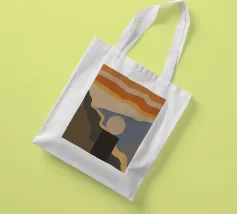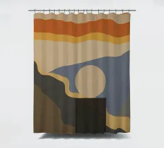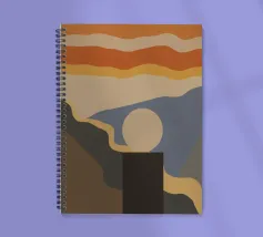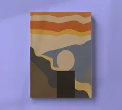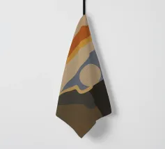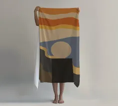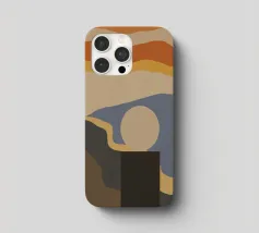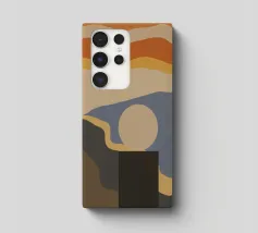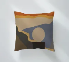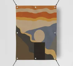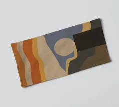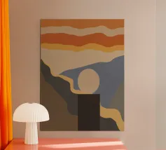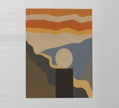 Una composizione geometrica presenta bande ondulate stratificate in tonalità terrose, con un cerchio centrale posto in cima a un rettangolo. La tavolozza dei colori comprende sfumature di arancio, marrone e blu, creando un paesaggio armonioso e astratto.
