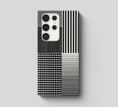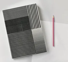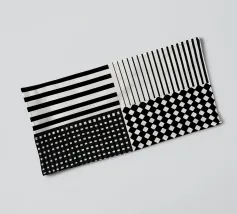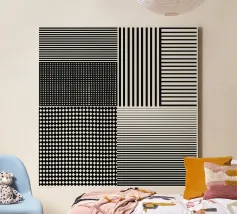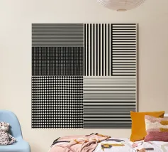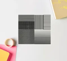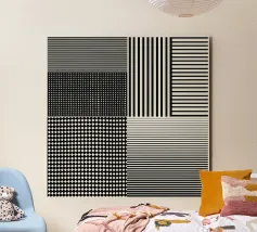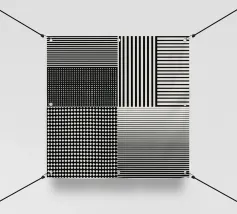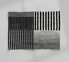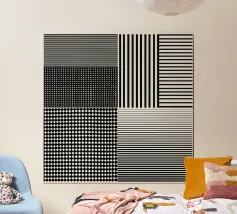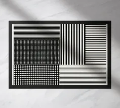 Questa precisa composizione presenta vari motivi geometrici in rigoroso bianco e nero: linee orizzontali, strisce verticali, griglie punteggiate e motivi a scacchiera. L'opera si colloca nella tradizione diretta della Op Art e del minimalismo hard edge - legato a Bridget Riley e Sol LeWitt. La disposizione sistematica esplora la percezione visiva e la variazione ritmica con la massima riduzione. Gli effetti ottici creano vibrazioni e movimento apparente nonostante gli elementi statici. Perfetto per gli amanti dell'arte concettuale e del graphic design! Pura potenza minimalista sulla parete.