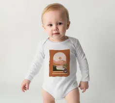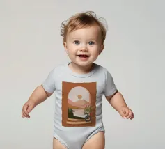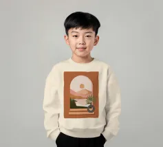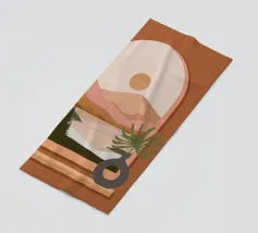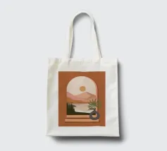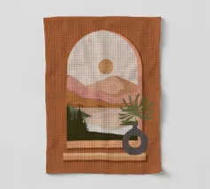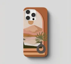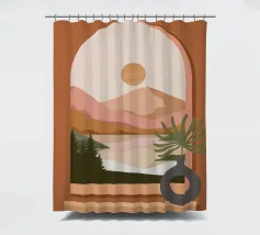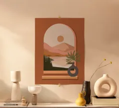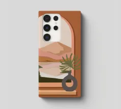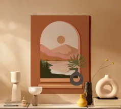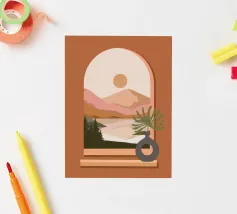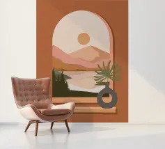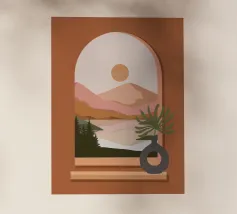 Una composizione minimalista presenta un vaso con una pianta verde davanti a una finestra ad arco, che mostra un paesaggio sereno con montagne, sole e lago in toni tenui. Le calde tonalità del marrone e del rosa creano un'atmosfera naturale e rilassante.