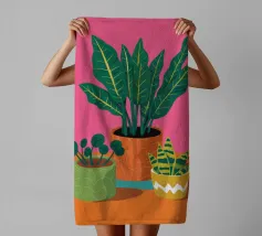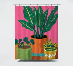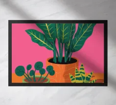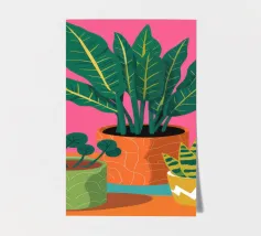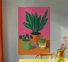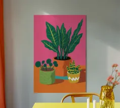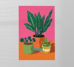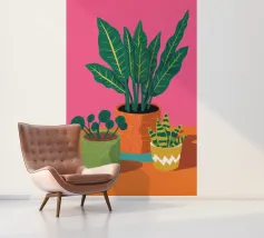 Illustrazione di tre piante d'appartamento in vasi divertenti, colorati e dai motivi stravaganti. La composizione è una celebrazione allegra, elegante e giocosa della genitorialità delle piante e dell'arredamento moderno.