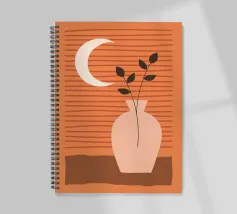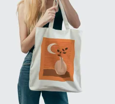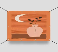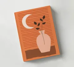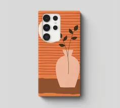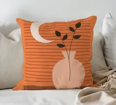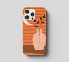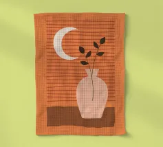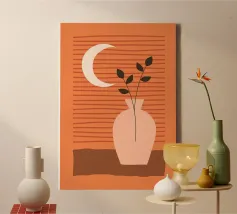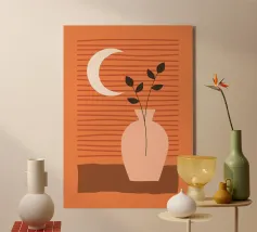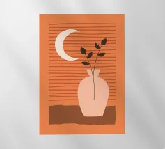 vaso luna crescente foglie sfondo a righe linee composizione minimalista ambientazione still-life toni neutri tavolozza terrosa design semplicistico forme geometriche arredamento d'interni arredamento per la casa stampa d'arte arredamento moderno elementi naturali botanico fogliame steli di piante scenario serale