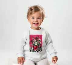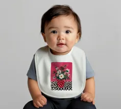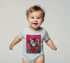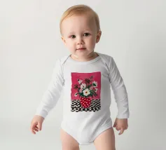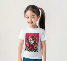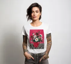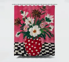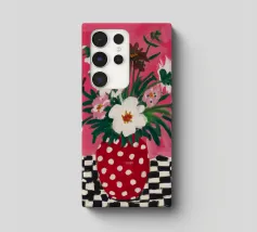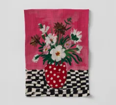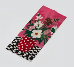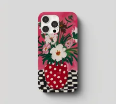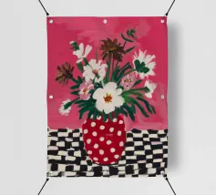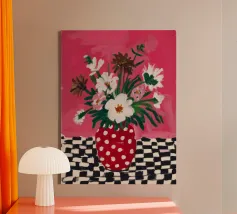 Un vivace bouquet di fiori misti, tra cui spicca una margherita bianca, in un allegro vaso rosso a pois bianchi. La composizione su uno sfondo a scacchi è un'esplosione gioiosa e giocosa di motivi e colori.