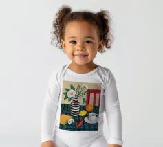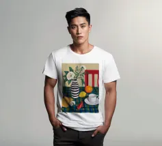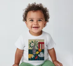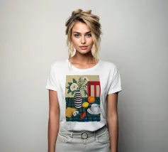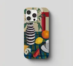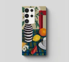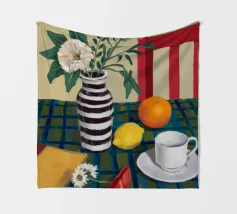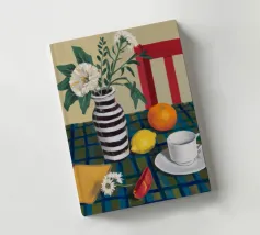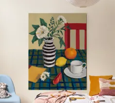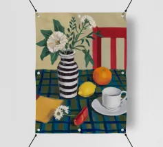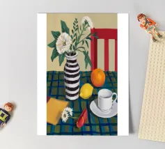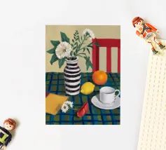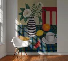 Elegante composizione di natura morta con fiori bianchi in un vaso a righe bianche e nere. Una sedia rossa, una tazza di caffè e un'arancia completano la scena, creando un momento equilibrato e tranquillo di vita quotidiana.