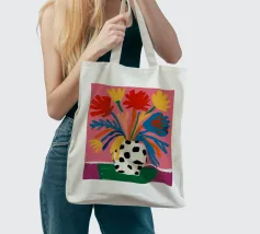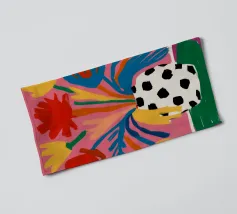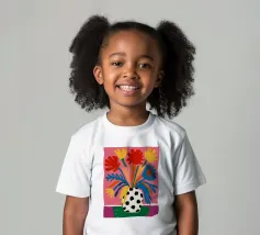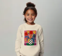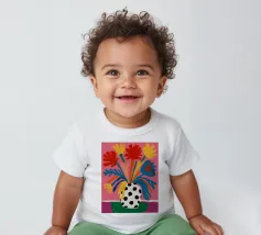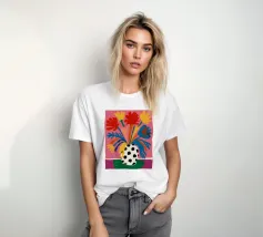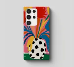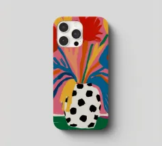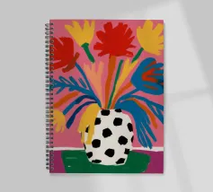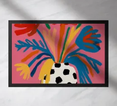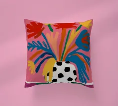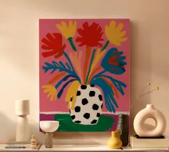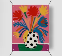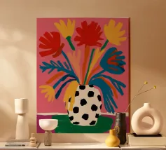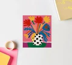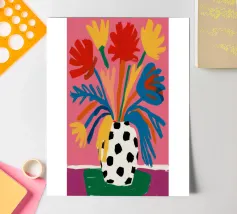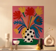 Un'audace illustrazione ispirata alla pop art di fiori colorati e stilizzati in un vaso a macchie bianche e nere con motivo dalmata. Lo sfondo rosa acceso e i fiori gestuali creano un pezzo divertente, moderno e di grande energia.