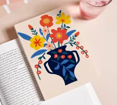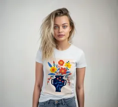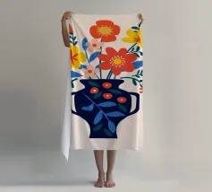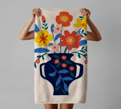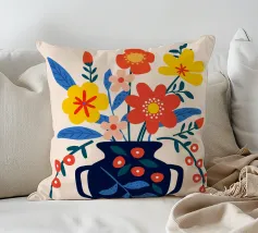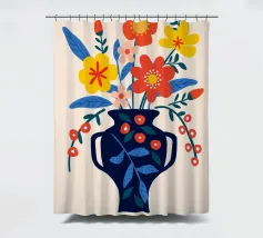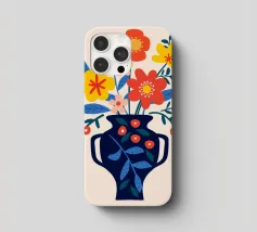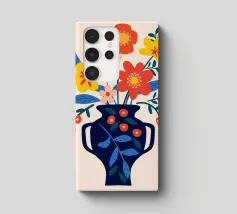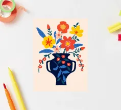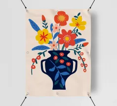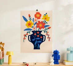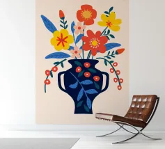 Una vibrante composizione floreale in un elegante vaso blu scuro che cattura il fascino di un giardino estivo. Questo disegno colorato combina il rosso, il giallo e il blu in modo armonioso, portando gioia e freschezza in ogni stanza. Perfetto come murale, tazza o copricuscino - ideale per gli amanti dei motivi floreali e delle decorazioni moderne.