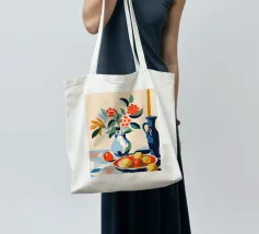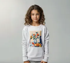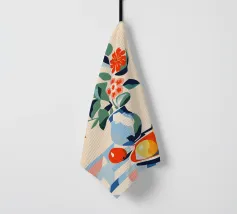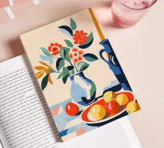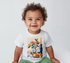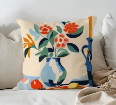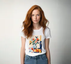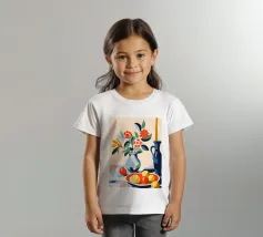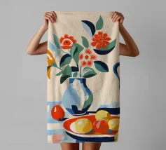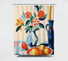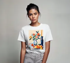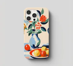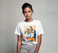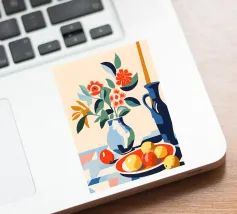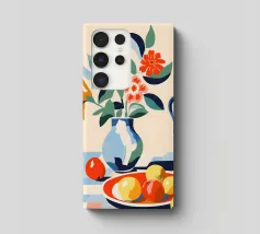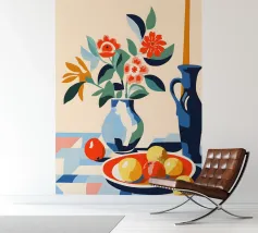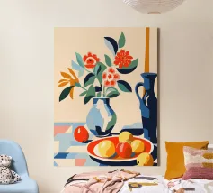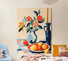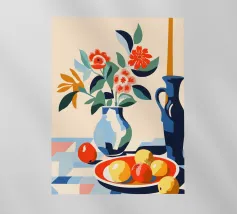 Questa affascinante natura morta combina la bellezza di un vaso fiorito con frutta fresca e brillante. I colori vivaci del rosso, del blu e del giallo conferiscono a questo disegno un aspetto armonioso e senza tempo. Perfetto per gli amanti dell'arte moderna e dello stile classico. Ideale per murales, tazze, cuscini o magliette, questo motivo porta un'atmosfera calda e invitante nella vostra casa.