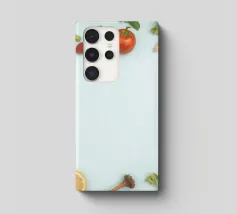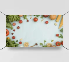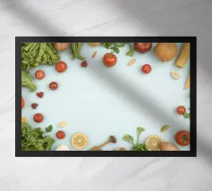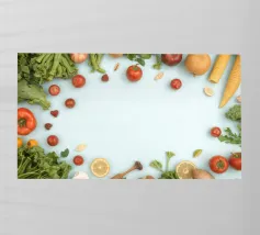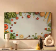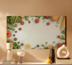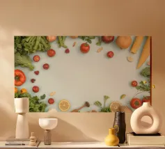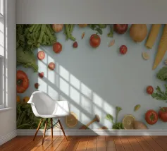Un vivace assortimento di frutta e verdura fresca è disposto artisticamente su uno sfondo chiaro. L'esposizione comprende pomodori, verdure, carote e agrumi, creando un banchetto colorato.