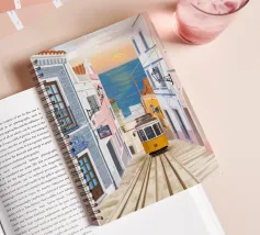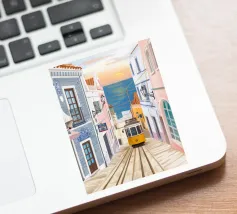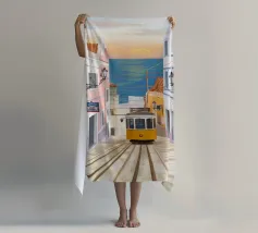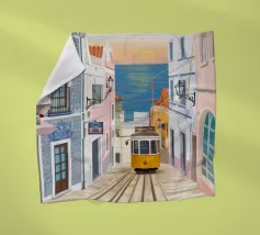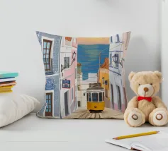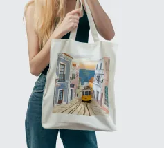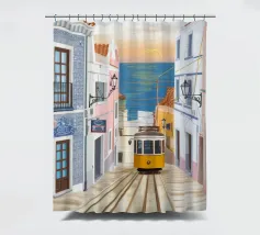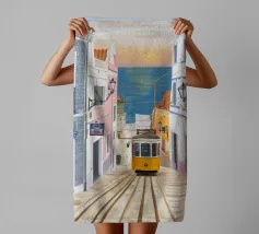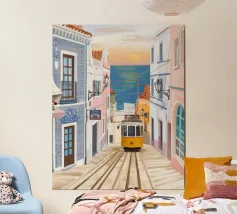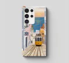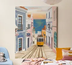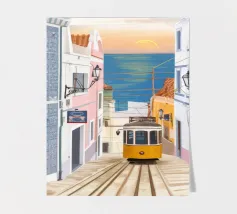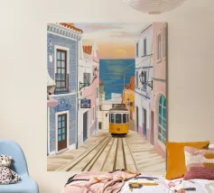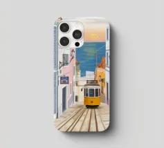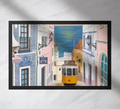Un classico tram giallo di Lisbona percorre un'affascinante strada illuminata dal sole e fiancheggiata da edifici tradizionali europei, evocando l'atmosfera nostalgica e vibrante della capitale portoghese.