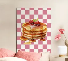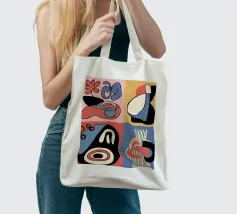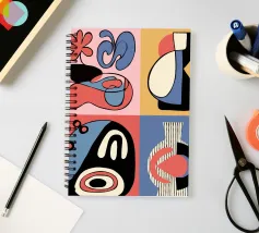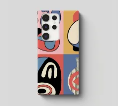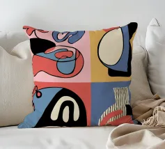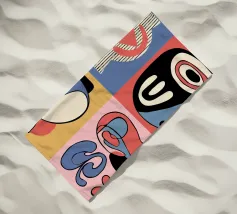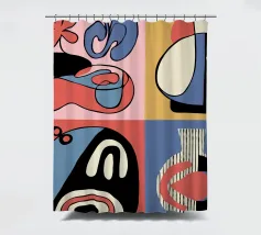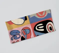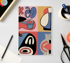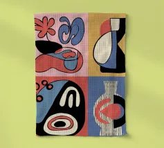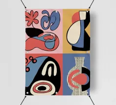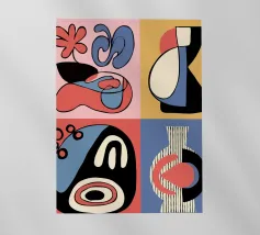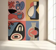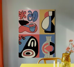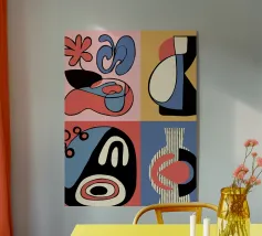 Forme astratte e colori vivaci creano una composizione di grande impatto visivo, suddivisa in quattro quadranti. Ogni sezione è caratterizzata da forme organiche e geometriche uniche, che mescolano curve morbide e linee decise.
