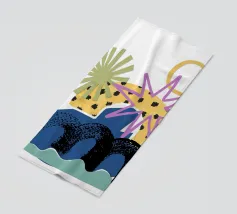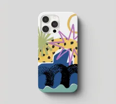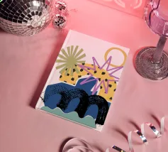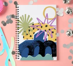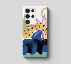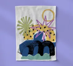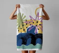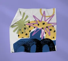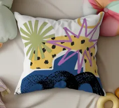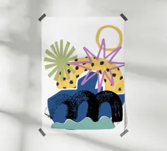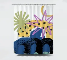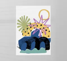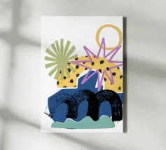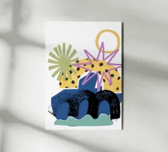 Un vivace mix di forme astratte combina colori e motivi audaci, con esplosioni di stelle, archi e onde. Elementi dinamici come il raggio di sole verde, l'arco giallo con macchie nere e la stella viola creano un senso di movimento.