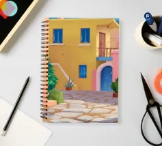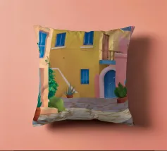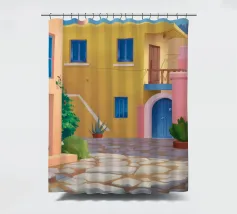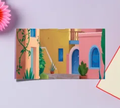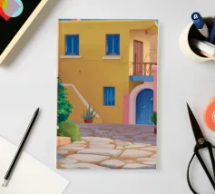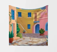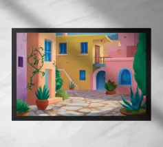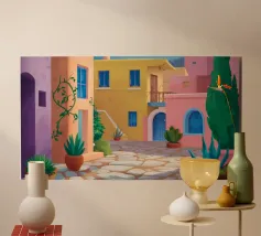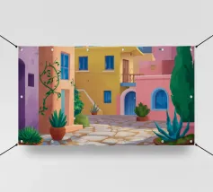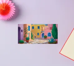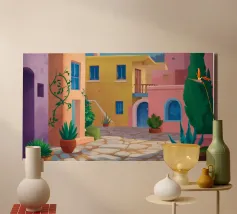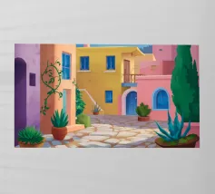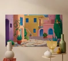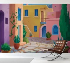 Un affascinante vicolo europeo con piante in vaso colorate, un cipresso e pareti illuminate dal sole, che creano un'atmosfera mediterranea tranquilla e invitante.