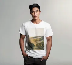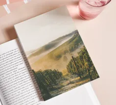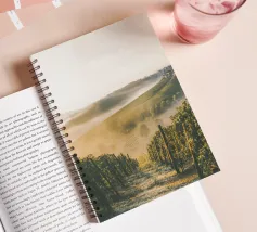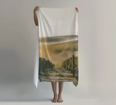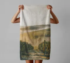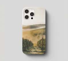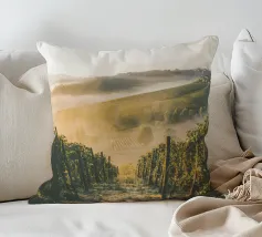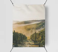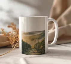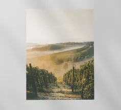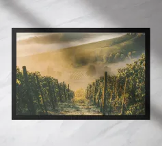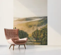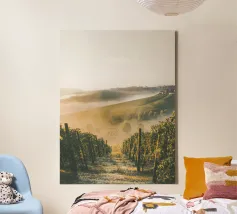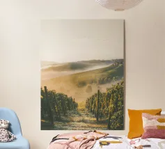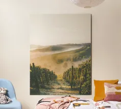 Questo motivo d'atmosfera mostra un vigneto idilliaco alla luce dorata del sole del mattino. Le dolci colline e la nebbia sullo sfondo conferiscono all'immagine un'atmosfera romantica e toscana che invita a sognare. Ideale per gli amanti dei paesaggi mediterranei e degli idilli rurali che desiderano portare un pezzo d'Italia nella propria casa. Che si tratti di un murale, di un cuscino o di una tazza, questo disegno trasmette la tranquillità e la bellezza della viticoltura e porta un tocco di atmosfera autunnale in ogni stanza.