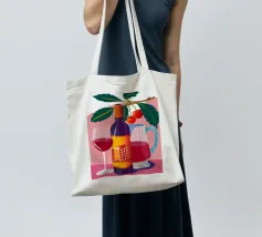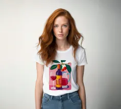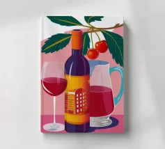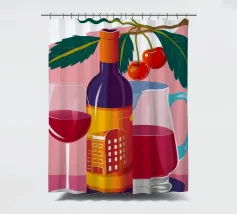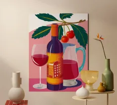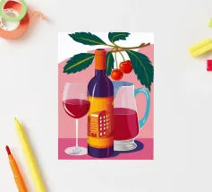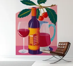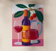 Due bicchieri di vino rosso sono sullo sfondo del mare, con un tralcio di ciliegie fresche e mature in primo piano, a suggerire un vigneto sulla costa.