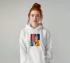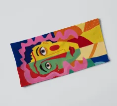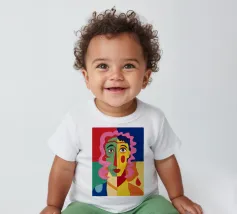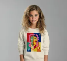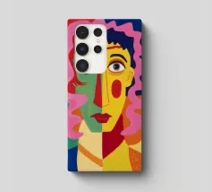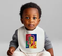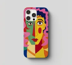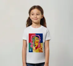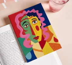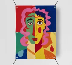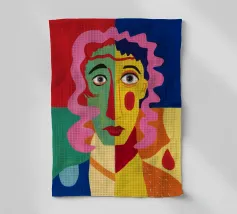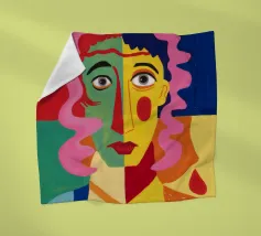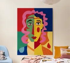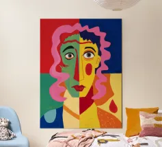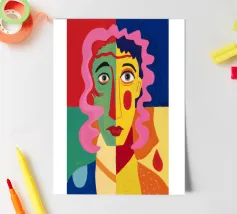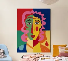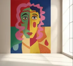 Un ritratto frammentato in stile cubista utilizza forme geometriche audaci e colori contrastanti come il rosa, il giallo, il blu e il verde per creare un volto enigmatico e stimolante.