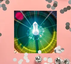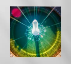 Una prospettiva aerea cattura una magnifica fontana circondata da acqua scintillante, che riflette colori vivaci mentre il sole tramonta sul parco sereno.