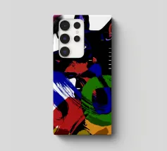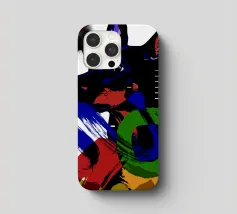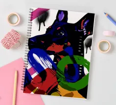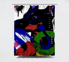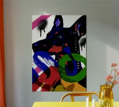 La vivace rappresentazione di un dobermann è arricchita da audaci spruzzi di colore, tra cui verde, blu e rosso. Forme geometriche ed elementi pittorici gocciolanti aggiungono un tocco dinamico e moderno alla composizione.