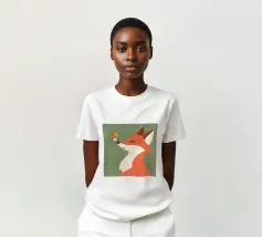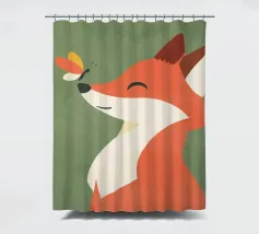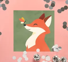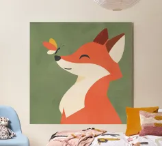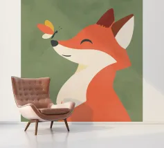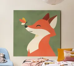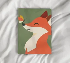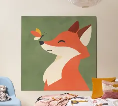 Una pacifica volpe con un occhio chiuso e una farfalla colorata che svolazza sul naso. Un motivo pacifico, pieno di fascino e di vicinanza alla natura: una simpatica volpe in un design minimalista e stilizzato. Scena armoniosa con farfalla svolazzante Simboleggia pace, amicizia e natura Ideale per progetti adatti ai bambini e temi delicati Colori tenui su uno sfondo verde e tranquillo